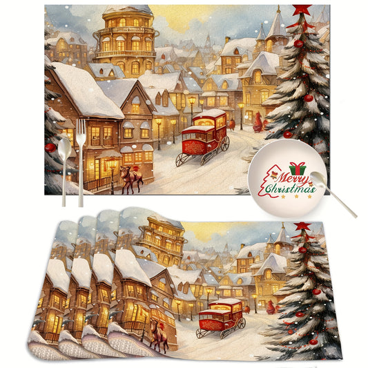1/4 Pcs, Christmas Theme Linen Placemats, Vintage Christmas Tree House Snowflake Red Car Pattern Table Mat