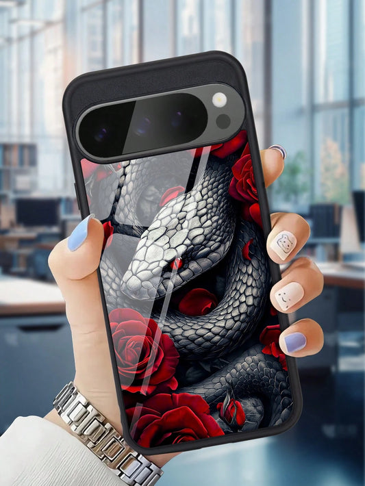 1pc Red Rose Serpent High Definition Glass Phone Case, Compatible With IPhone 16 Pro Max/16 Pro/16 Plus/11/11 Pro/11 Pro Max/12/12 Pro/12 Mini/12 Pro Max/13/13 Pro/13 Pro Max/13 Mini/14/14 Plus/14 Pro/14 Pro Max/15/15 Plus/15 Pro/15 Pro Max/7/8 Plus/XR/XS