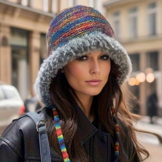 Vintage Rainbow Striped Beanie Thick Plush Ear Flap Hat Coldproof Warm Knit Hats Elastic Beanies For Women Autumn & Winter
