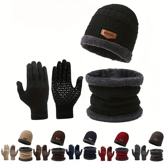 3pcs Set Men's Warm Scarf Gloves And Hat Set, Fleece Lined Cold Proof Knitted Hat For Winter