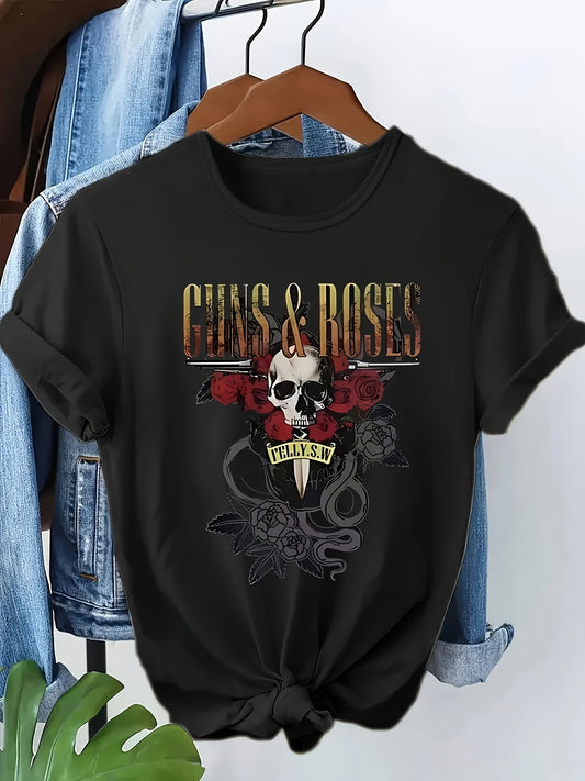 Plus Size Women's Graphic T-Shirt - Guns & Roses Skull & Roses