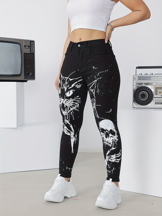 Cat & Skull Print Denim Jeans, High Waist Stretch Skinny Pants, 65% 33% Polyester 2% Elastane, Zipper Fly, All Season Party Wear, Woven Fabric, 390g/m², Long Length