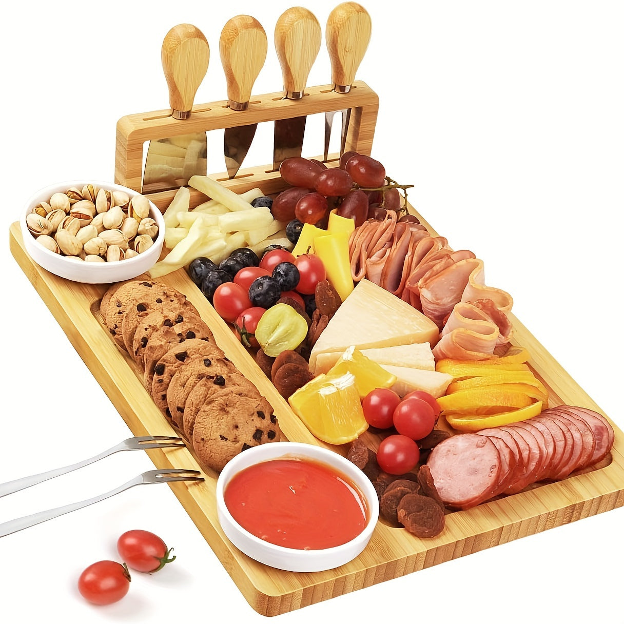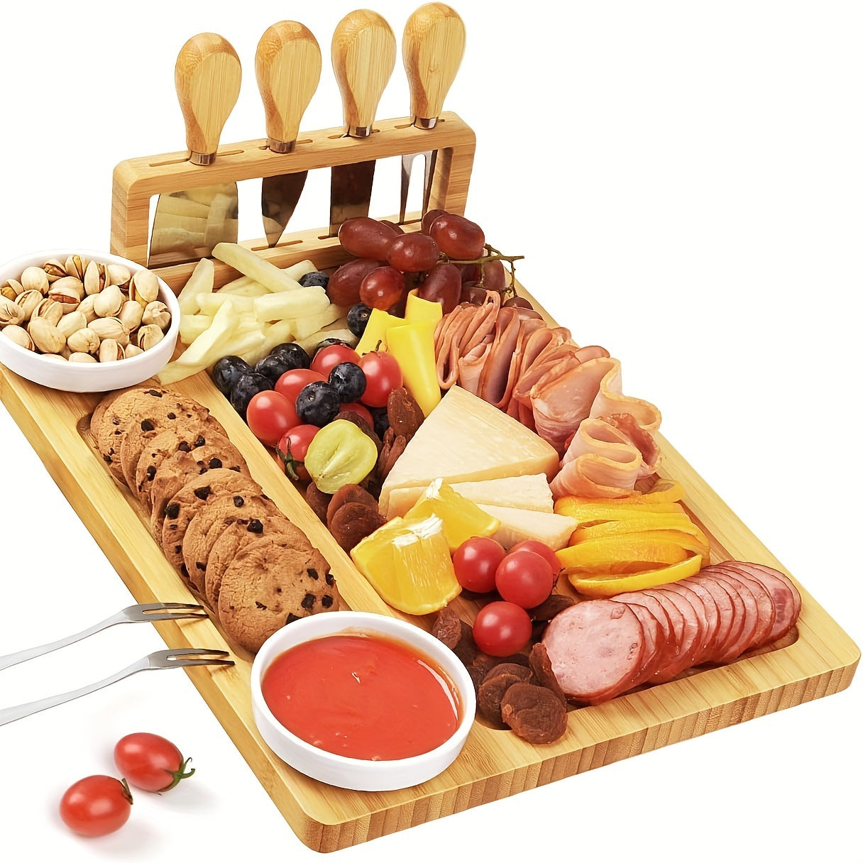 1 Set Cheese Board Set - Meat Cheese Tray, Deli Board Set With 4 Stainless Steel Cheese Knives, Perfect For Parties, Wedding Cheese Spatula, Bamboo Cheese Board And Knife Set, Cheese Plate, Serving Tray, Kitchen Supplies