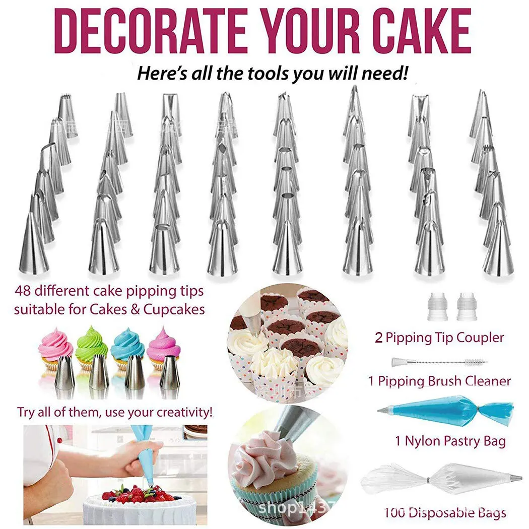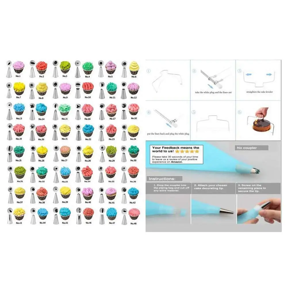 What You Get: 1 cake turntable 48 Stainless Icing Tip with 1-48 number,6 large icing tips with 1-6 Number,1 12inch Pastry reusable Bags,1 14inch Pastry reusable Bags,1 Cake Brush,1 Cake Cutter,1 Cake Pen,3 Cake Scrapers,2 cake nozzles small coupler,1 cake nozzles large coupler,25 disposable bag,1 Icing Spatula (27cm),1 Angled Icing Spatula - (27cm ),2 flower nail,1 Cake Flower Lifter,12pcs cupcake