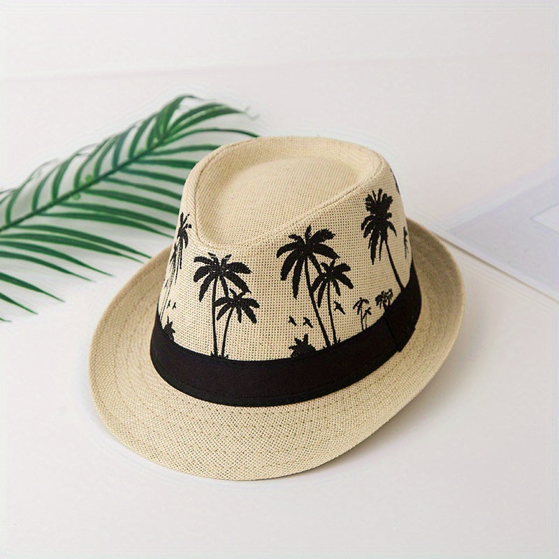 1pc Breathable Curved Brim Straw Sun Hat, Outdoor Summer Casual Cowboy Hat With Coconut Tree Pattern, For Outdoor Work And Travel