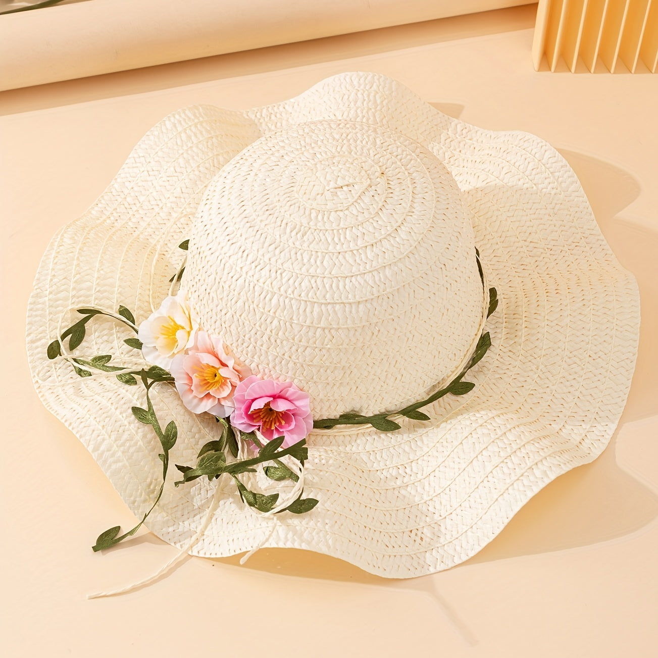 1pc Stylish Flower Leaves Ruffle Straw Hat - Exquisite Decoration, Fashionable Design, Sunshade Protection - Ideal for Outdoor Activities, Beach Vacation, and Summer Outings