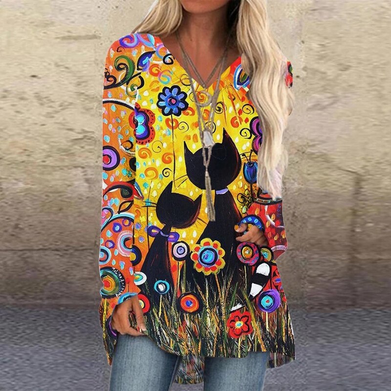 2021 Womens Loose Pullovers Long Tops Ladies Tee Casual Abstract Face Print Shirts Long Sleeve Top Fashion T Shirt S-5XL Black