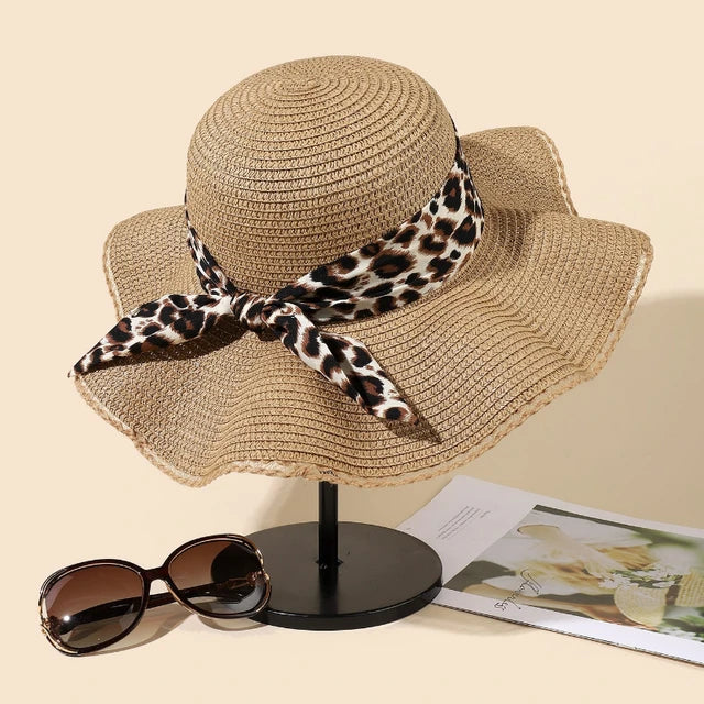 2024 New Women's Leopard Pattern Bow Big Eaf Straw Hat with Ribbon Sweet Straw Woven Hat Beach Hat