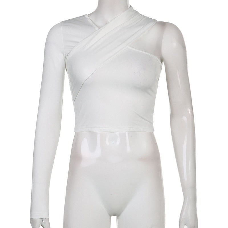 Asymmetrical V Neck One-shoulder Soild Women's T-shirts Slim Female Streetwear Crop Tops Autumn All-match Vinatge Tees