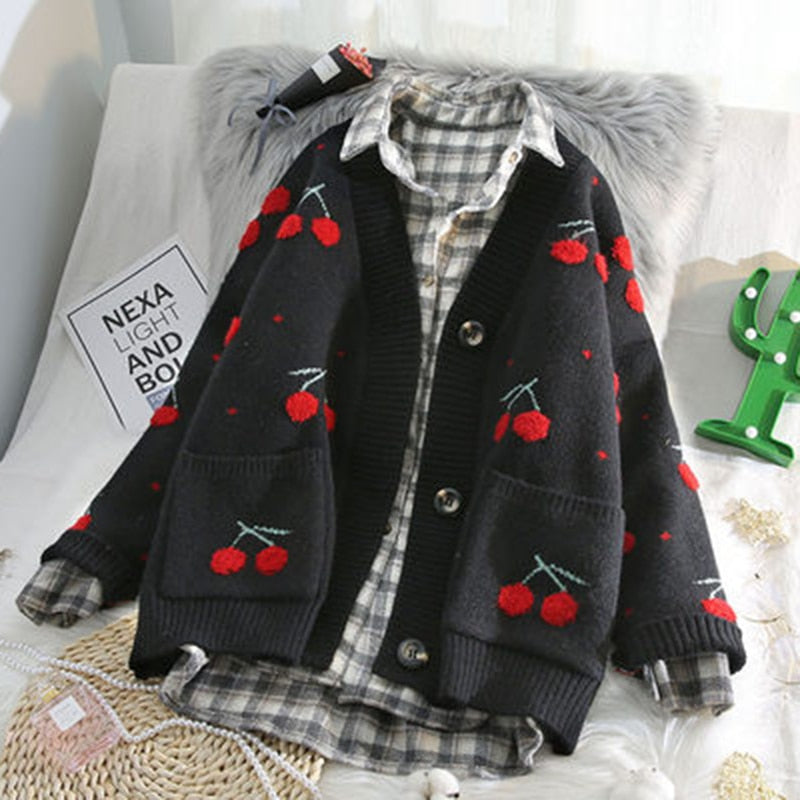 AZYT Fruit Cherry Embroidery Knitted Cardigan Loose Knit Pull Femme Autumn Winter V Neck Oversize Woman Sweater Cardigan Jacket