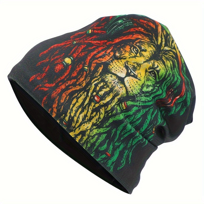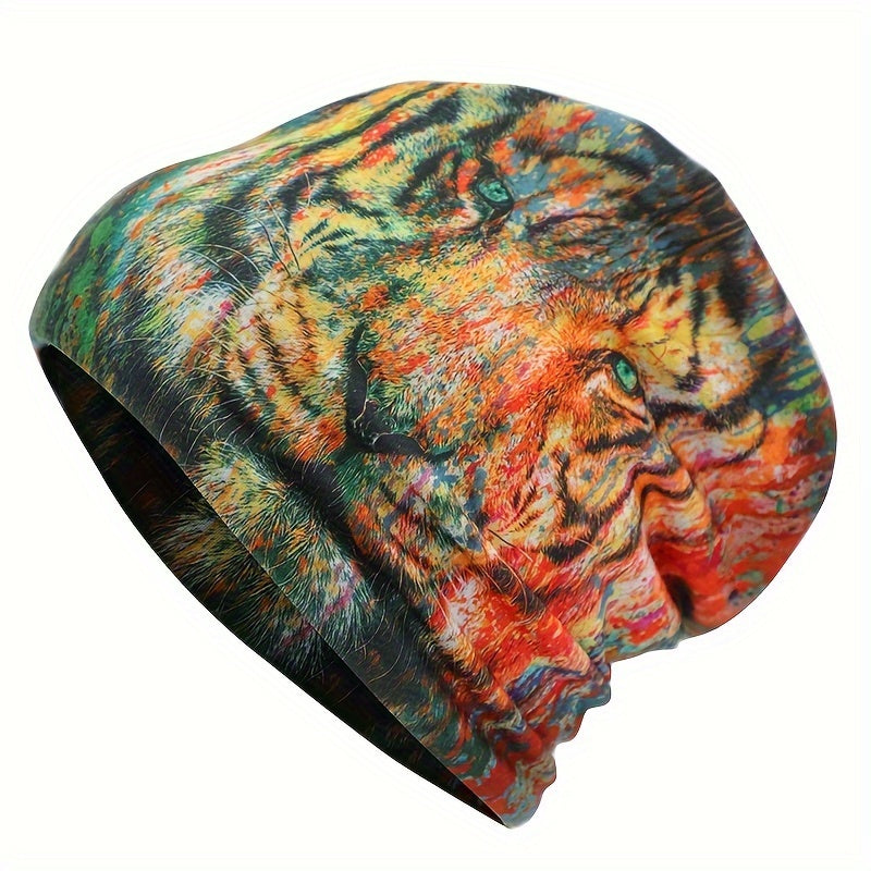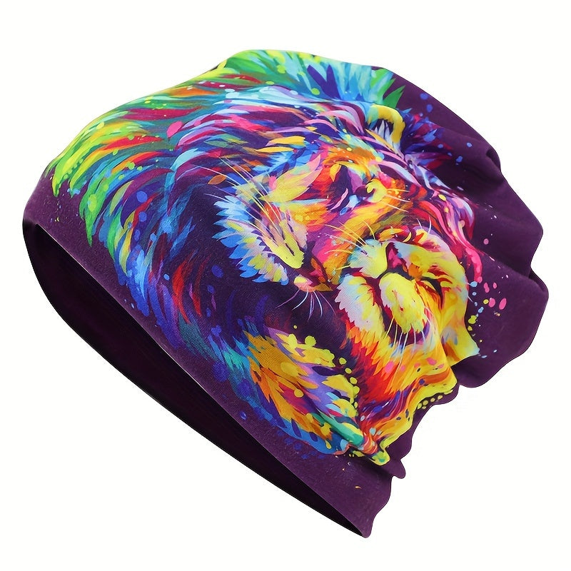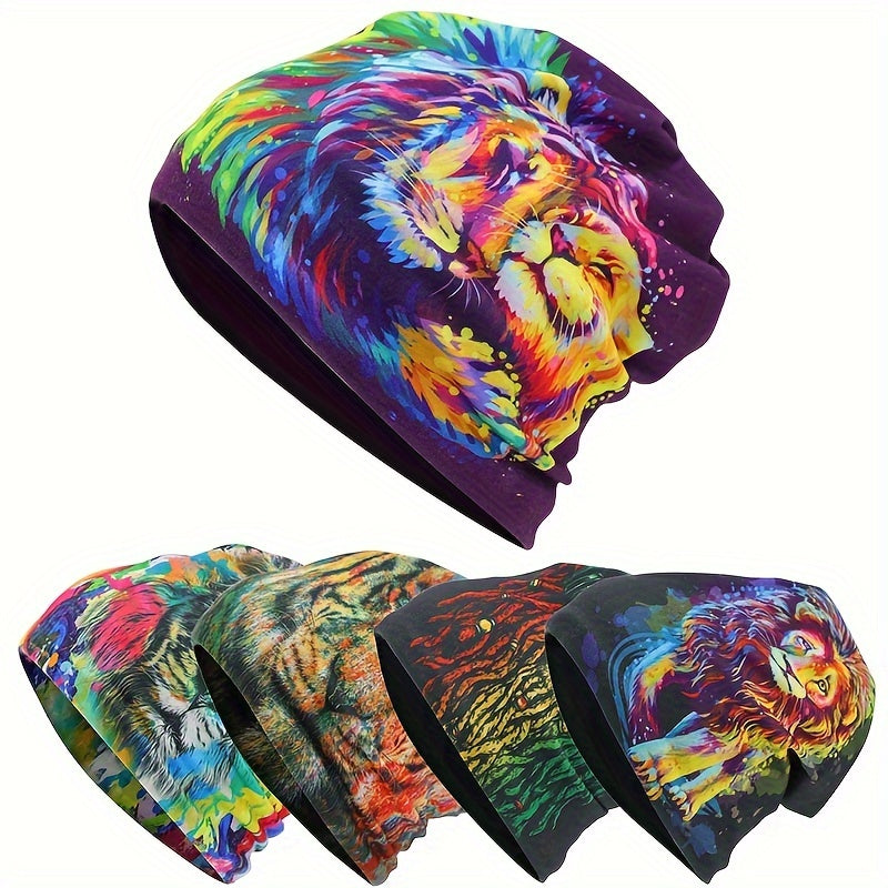 Cartoon Lion Print Slouchy Beanie Trendy Colorful Tie Dye Skull Cap Elastic Warm Beanies Chemo Cap For Women Men