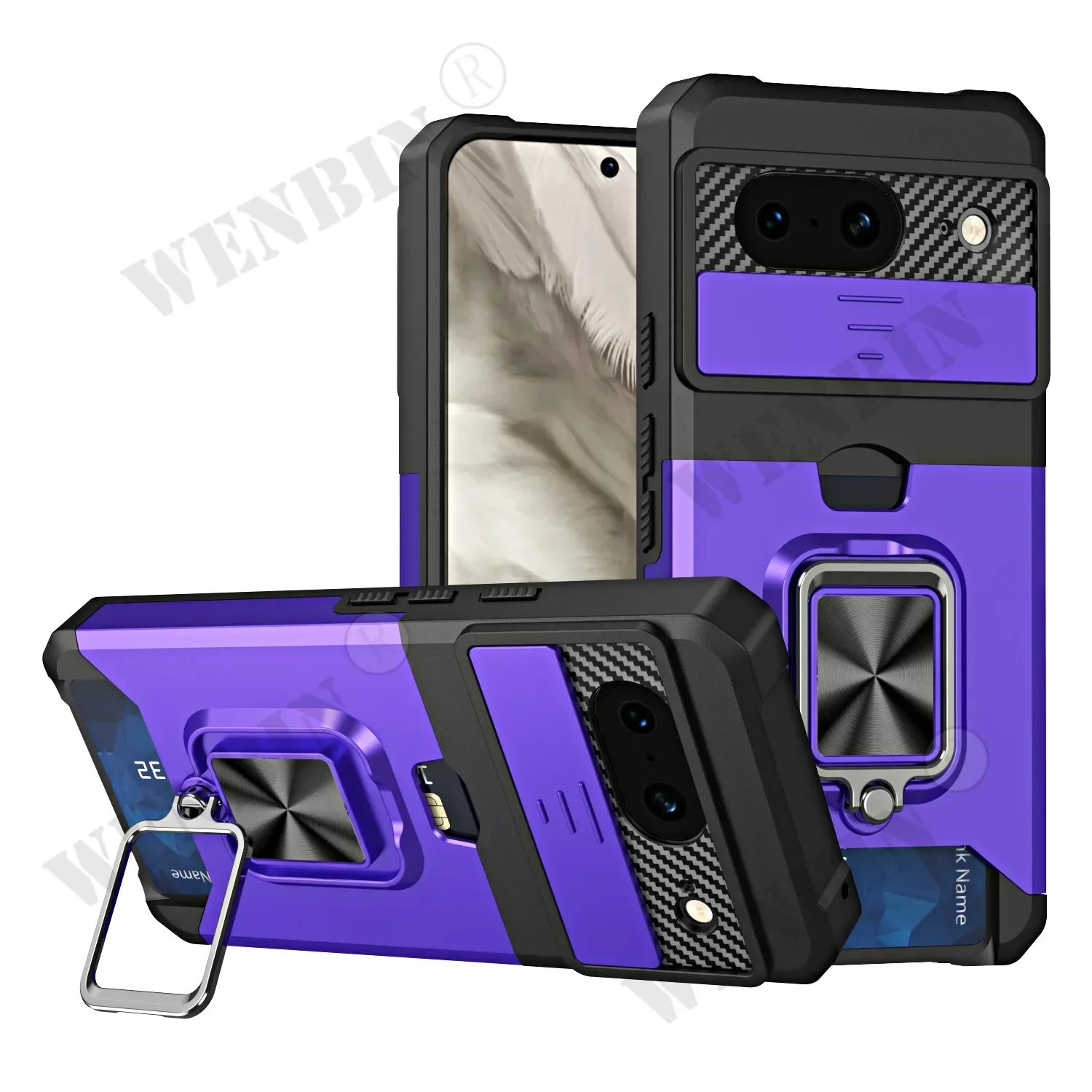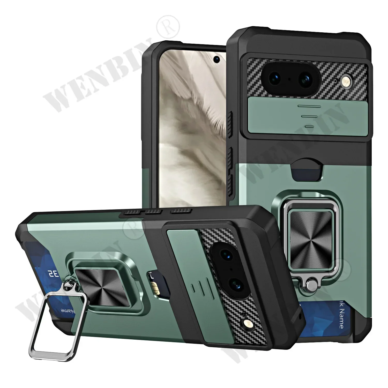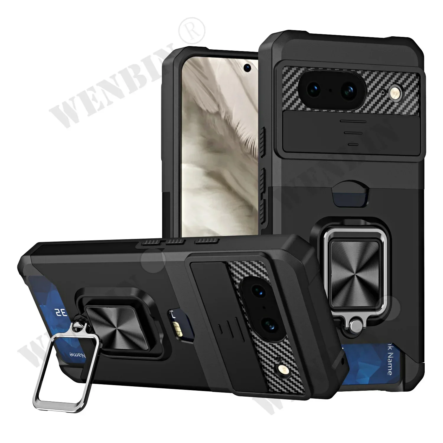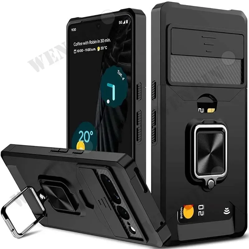 Case For Google Pixel 9 8 Pro XL 8A 7A 6 Sliding Camera Cover and Card Holder Heavy Duty Protective Magnetic Kickstand Ring