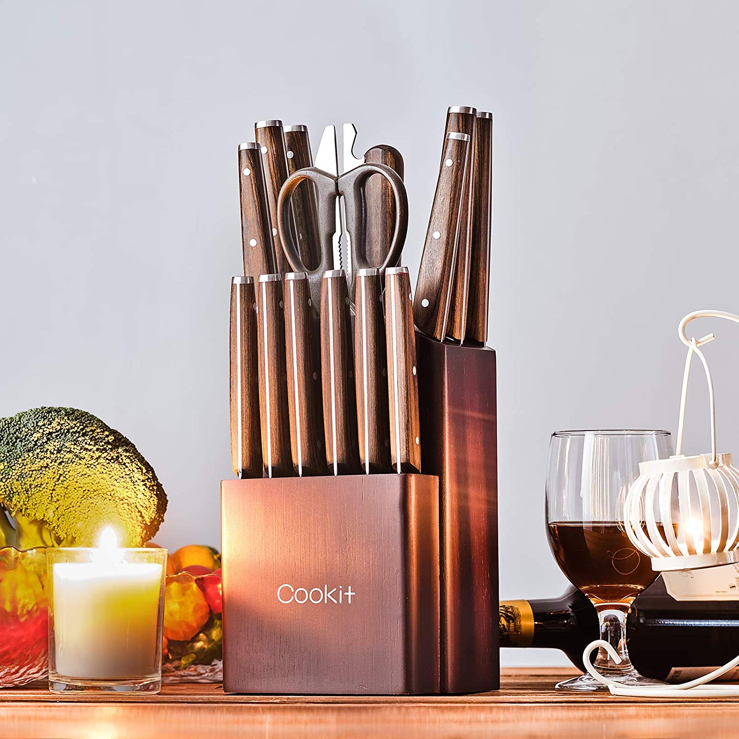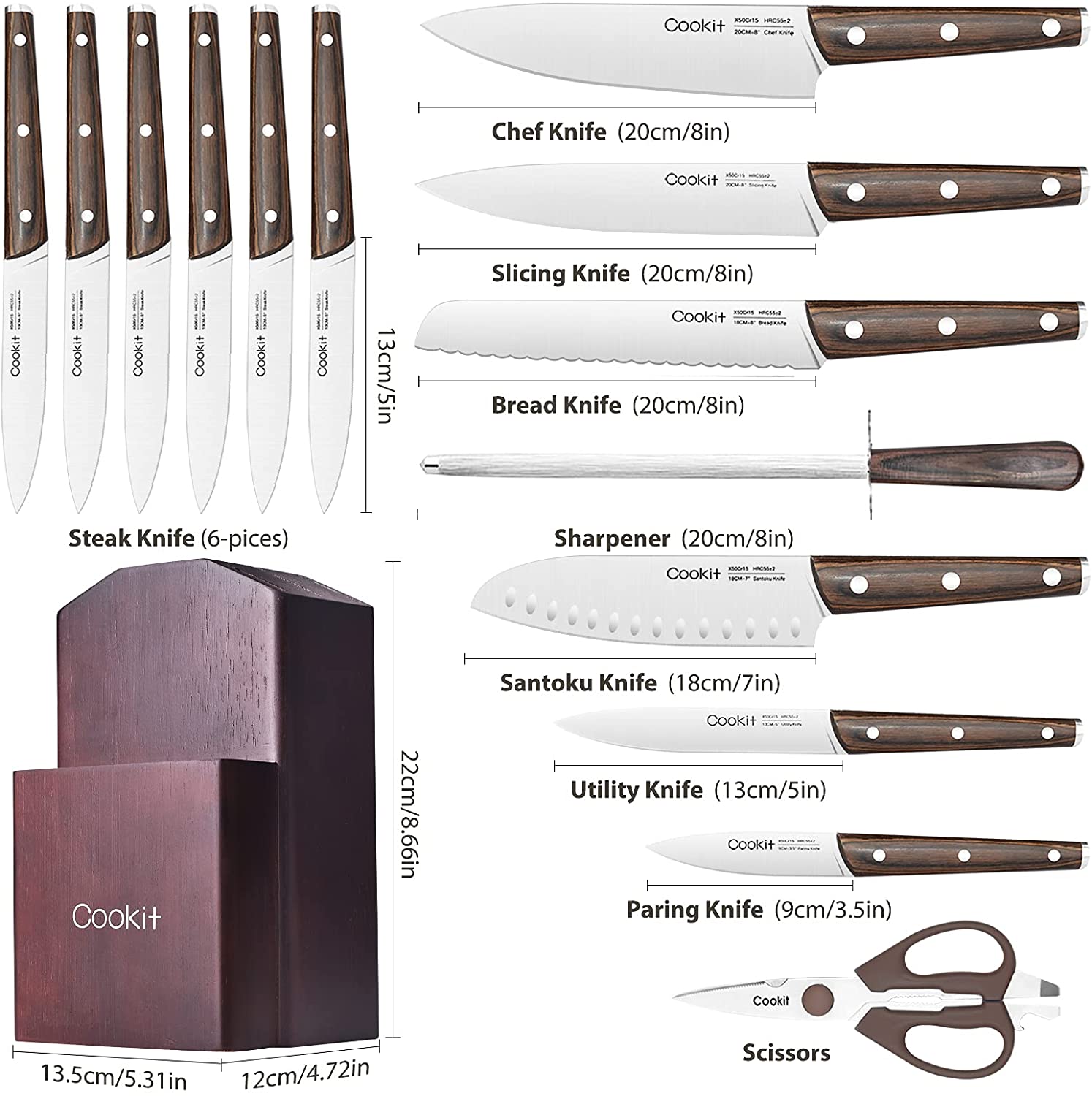 VALUE KITCHEN KNIFE SETS - Knives set includes a chef knife, bread knife, slicing knife, santoku knife, utility knife, paring knife, steak knife, kitchen scissors, knife sharpener and oak wooden knife block. The unique slim design of the knife block gives the aesthetic of a modern yet traditional look that is universal for gifting.