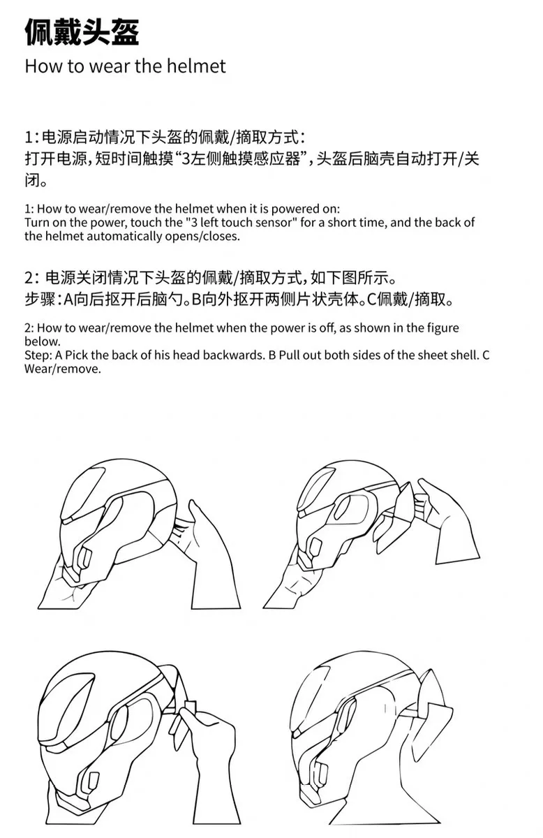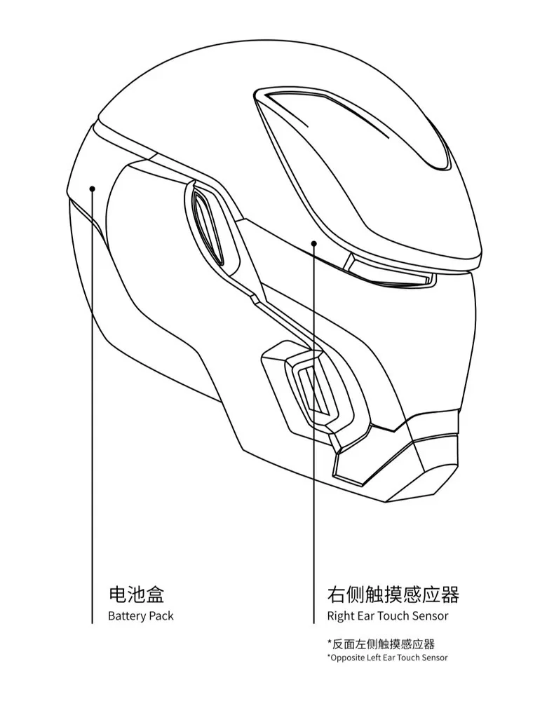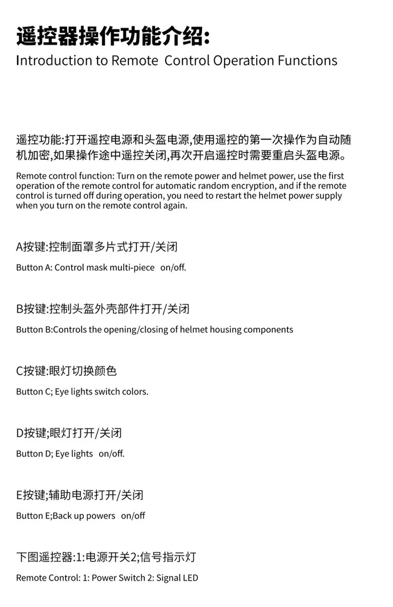 Turn on/off the mask, turn on/off the helmet mask as a whole, and switch the eye lights and ear lights to different colors;