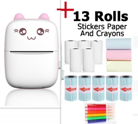 With 13Rolls: printer +5 rolls of printer paper (non-sticky) +5 rolls of self-adhesive paper (sticky) +3 rolls of colored paper (non-sticky) +5 colored pens