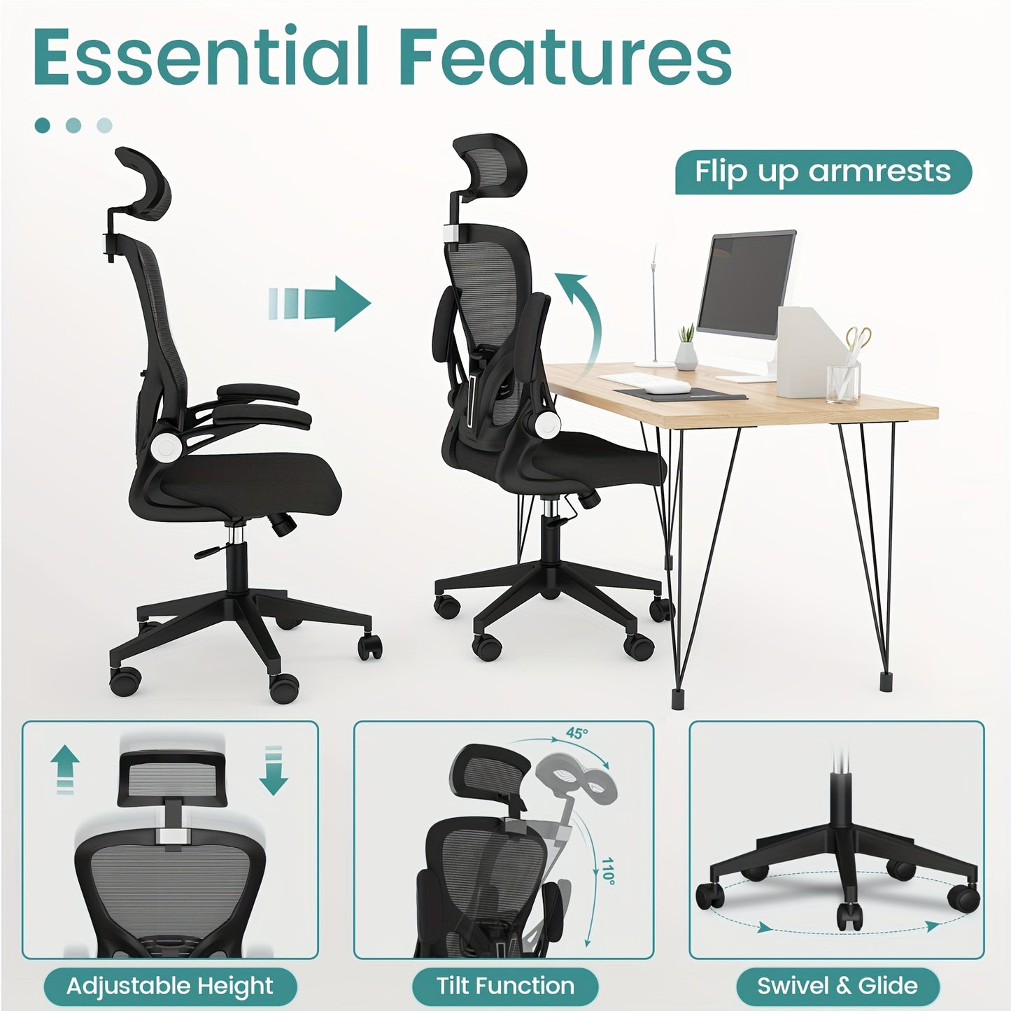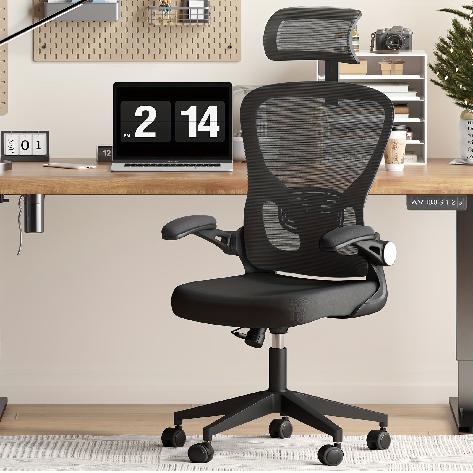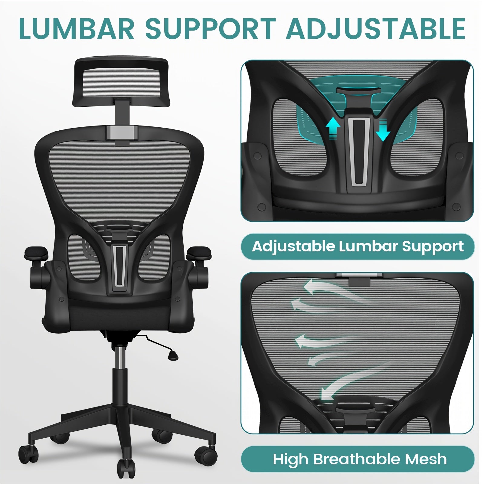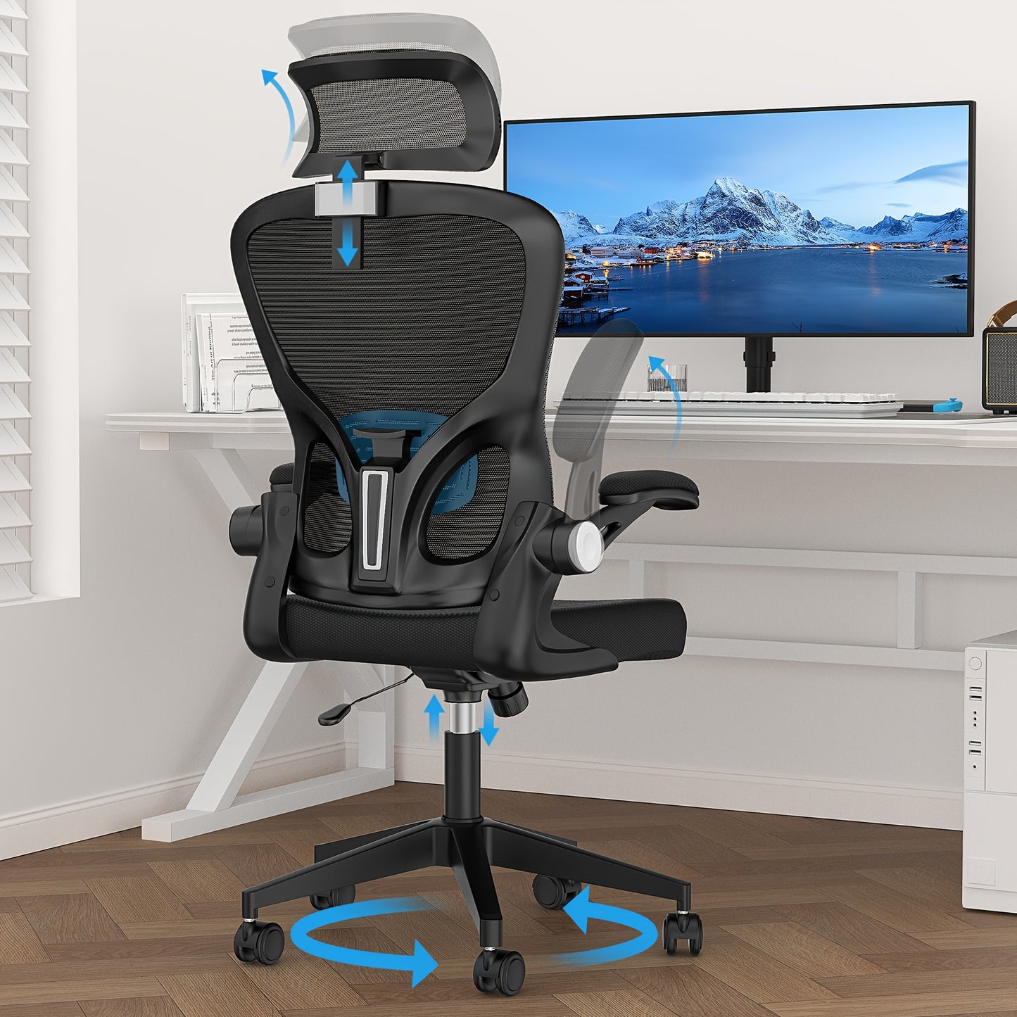Ergonomic Black Office Chair with Adjustable Lumbar Support, 360° Swivel & 90° Flip-Up Armrest - Steel Alloy Frame, Memory Foam Seat, Headrest, Wingback Design - Perfect for Home Office, Workspace, or Bedroom, Desk Chair
