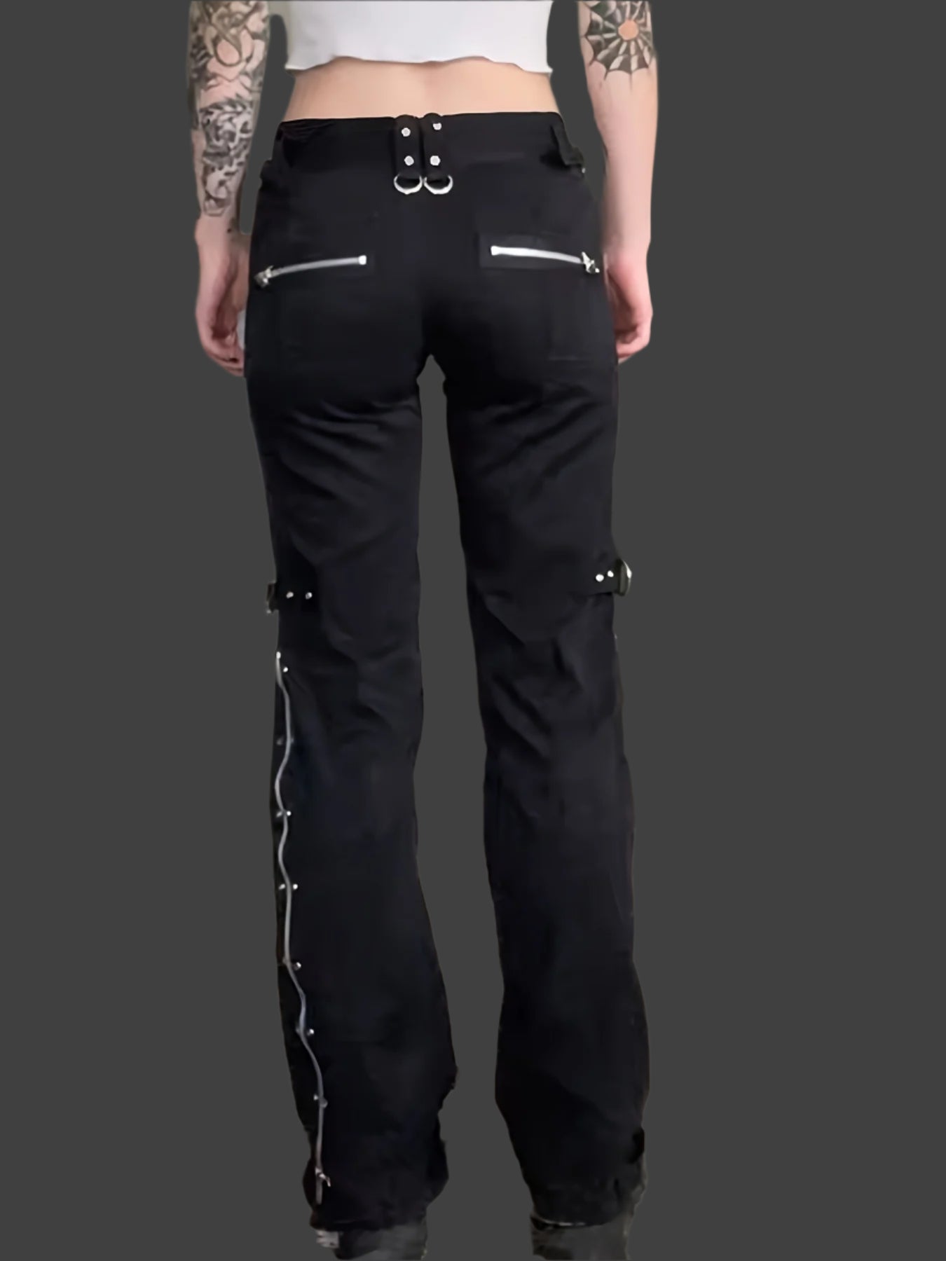 Punk Y2K Cyber Goth Straight-Leg Pants with Chain-Link Rings - 100% Polyester Machine-Washable Black Trousers for Adults, All-Season Gothic Punk Style