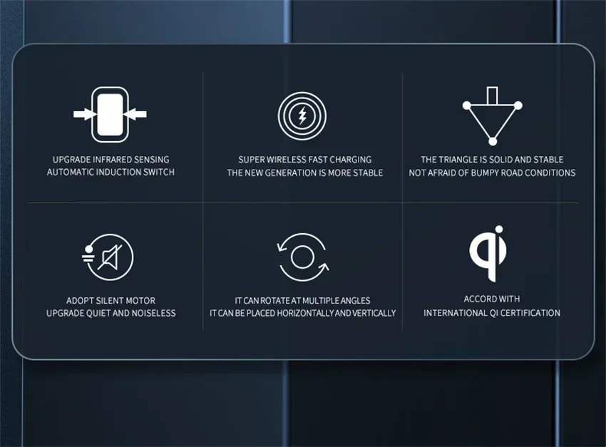360-degree rotating cradle provides flexible choice of watching your phone or GPS while driving. That means there will be no blocked vision and you can get a perfect viewing angle with the car wireless charger mount.