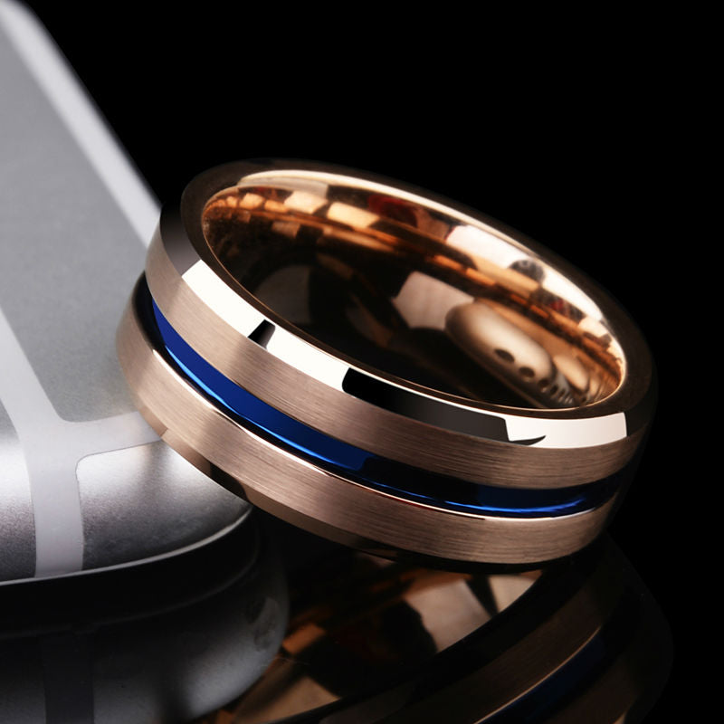 New Arrival 8MM Width Rose Gold Man Jewelry Rings Tungsten Carbide Band with Thin Blue Groove and Brushed Finishing