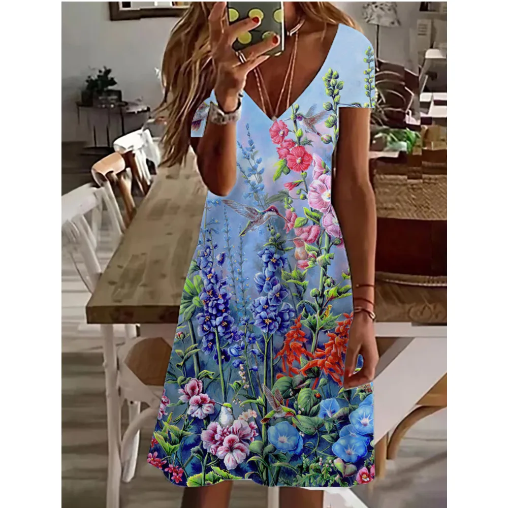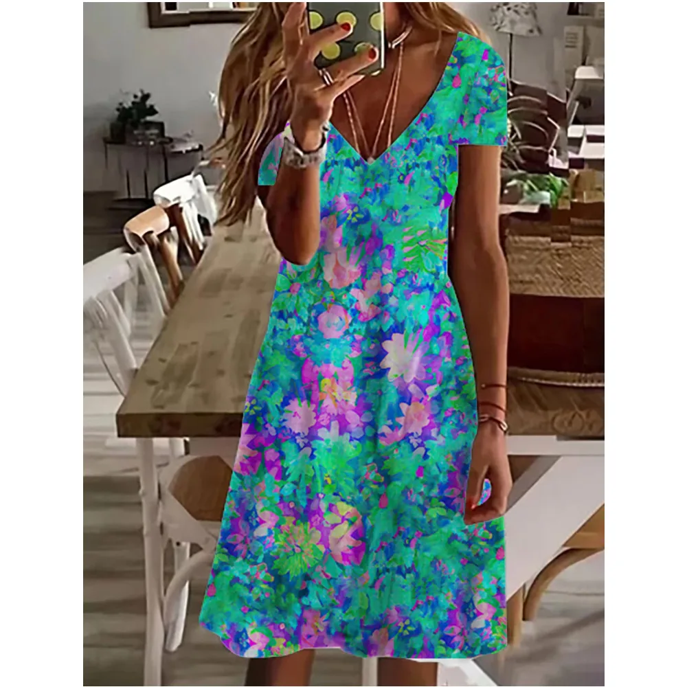 Short Sleeved Women's Midi Dress The Latest Summer 2024 Women's Fashion Print V-neck Sweet And Fresh Floral Dresses