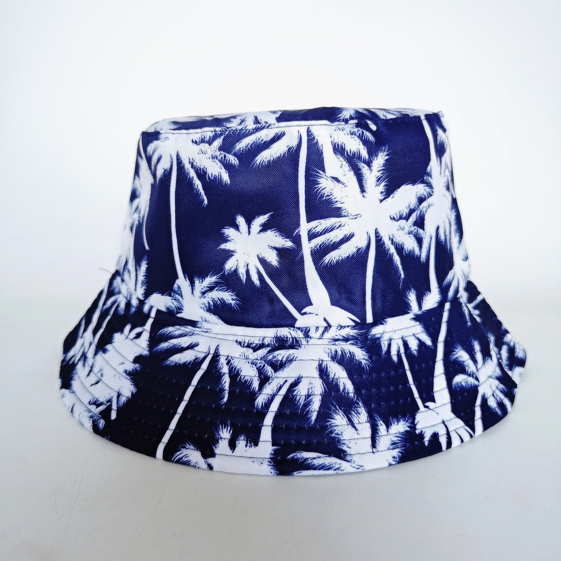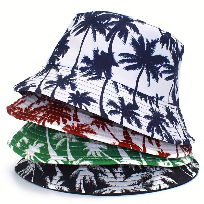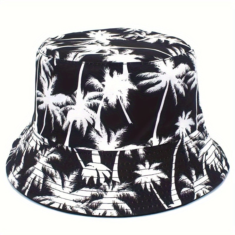 Trendy Korean Retro Coconut Tree Print Bucket Hat - Double-Sided Design for Street Style & Beach Fun - Versatile Sun Protection Basin Hat