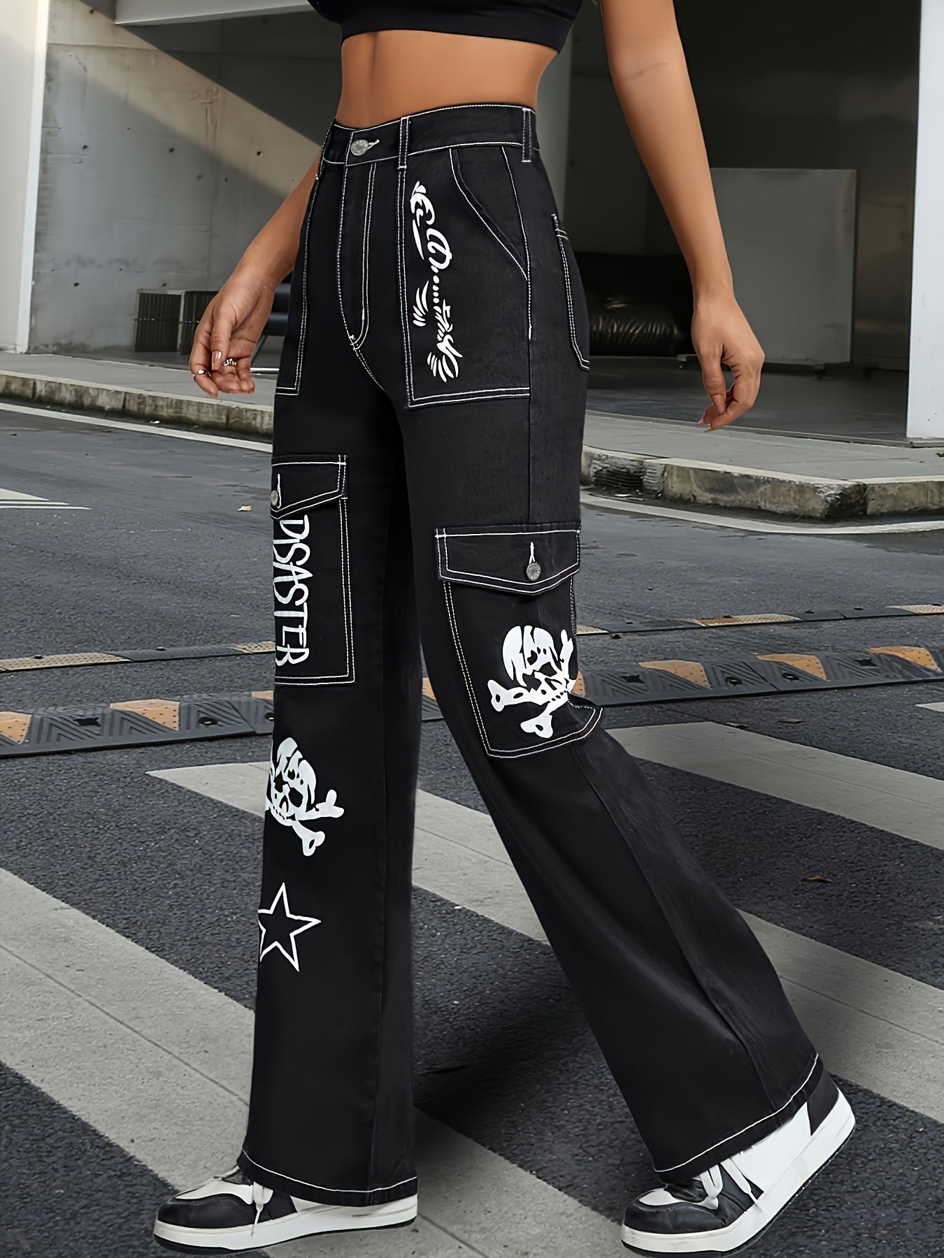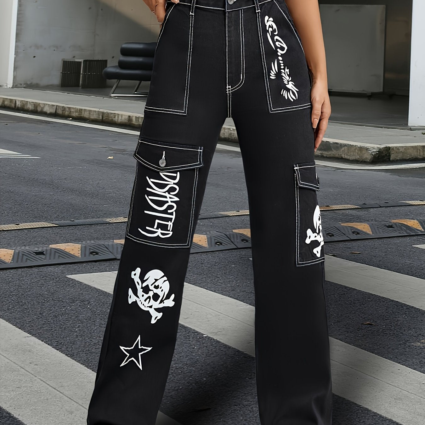 Women's High-Waist Vintage Y2K Cargo Jeans - Loose Fit, Straight Leg, Denim with Geometric Prints, Stars, and Skulls, Stretch Fabric, Multiple Pockets