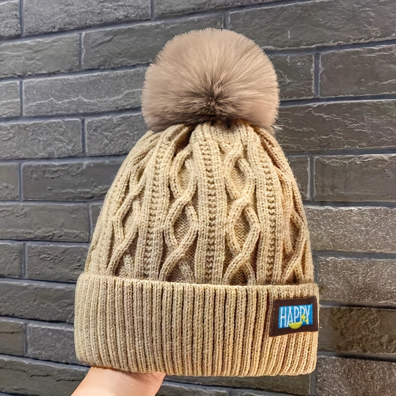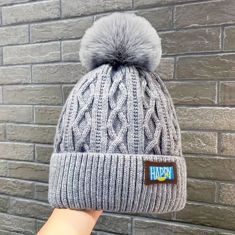 Women's Letter Patched Winter Fashion Cable Knitted Hat With Pom Poms, Lightweight Beanie Hat